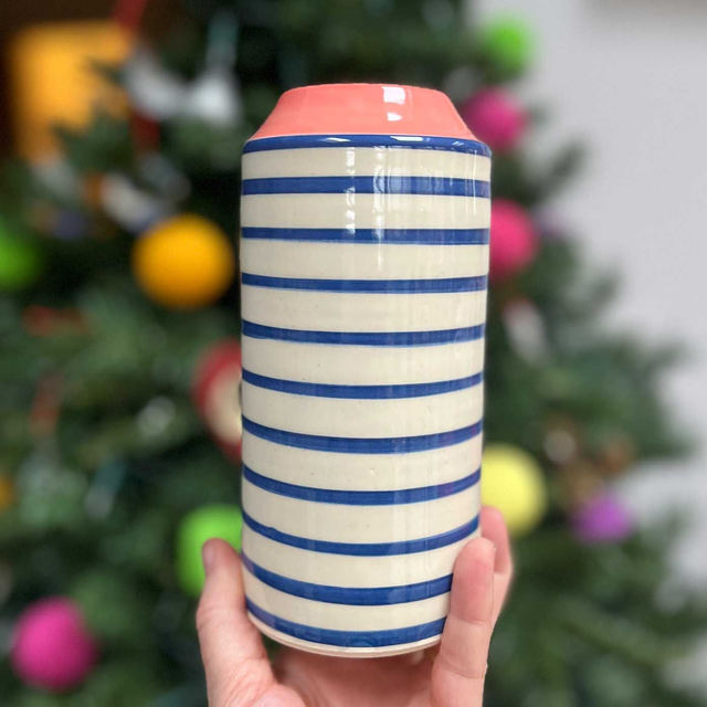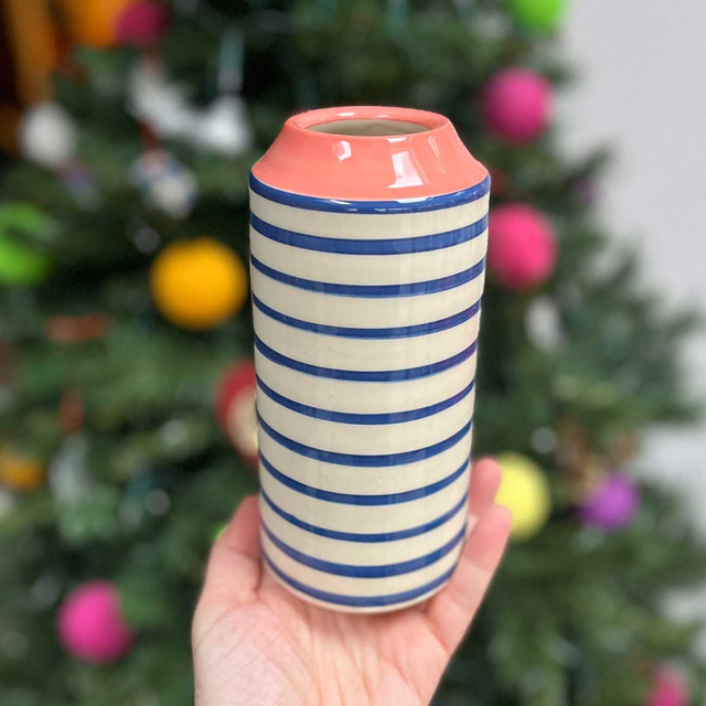 A handmade stoneware ceramic vase. Painted with blue stripes and a contrasting colour top, glazed in a clear glossy glaze.