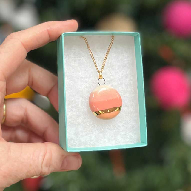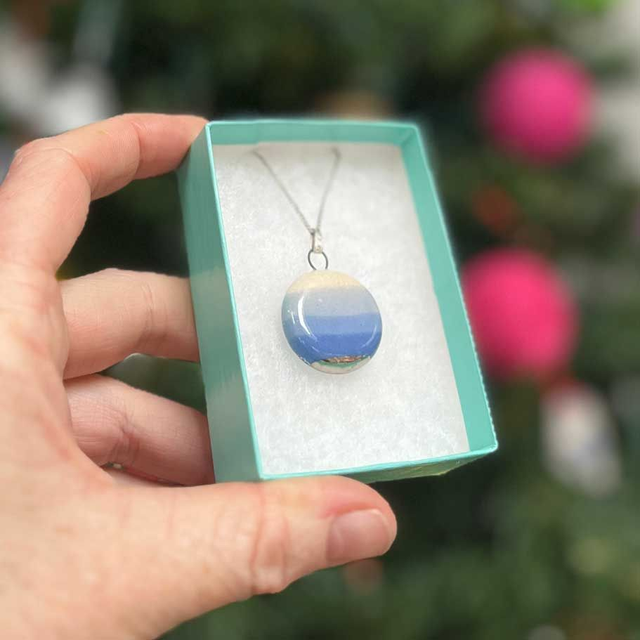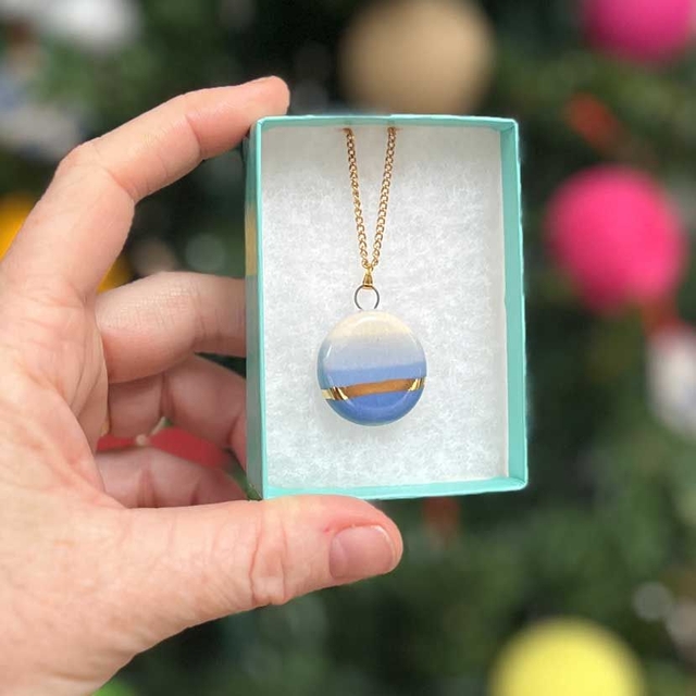 Handmade ceramic button shaped pendant. This pendant has been triple dipped in 3 colour gradients and highlighted with real platinum or 24karat gold detail, supplied on either a silver sterling chain (for the platinum detail) or a gold plated chain (for the gold detail).
