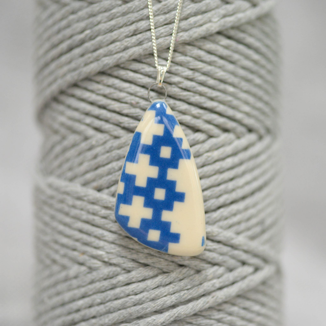Handmade ceramic Welsh Caernarfon blanket patterned large drop shaped pendant on a silver sterling chain.