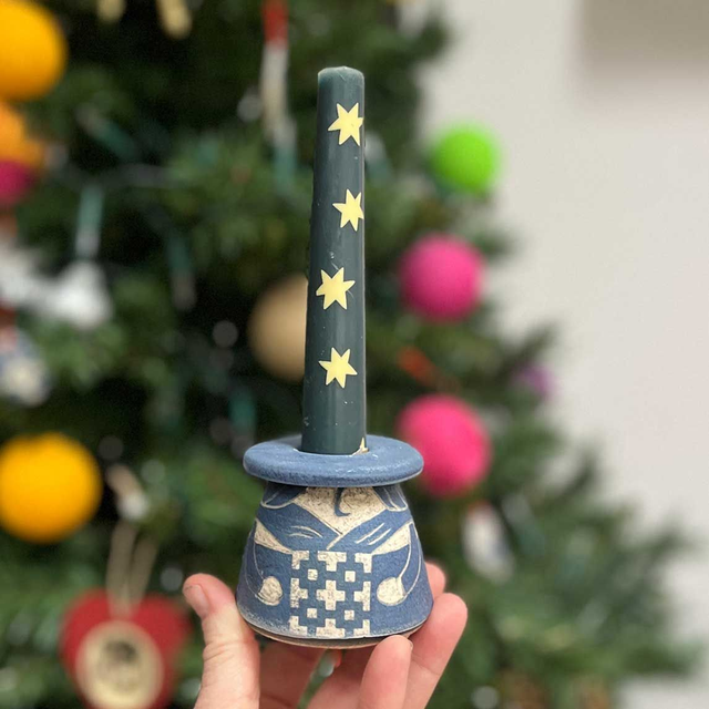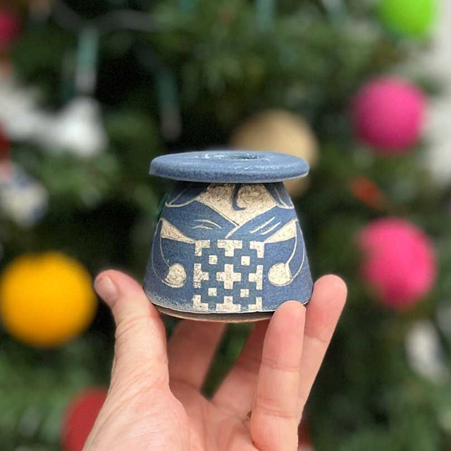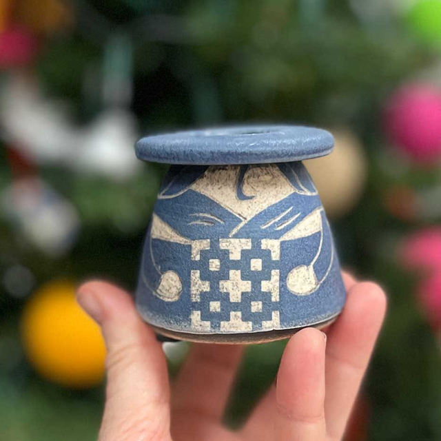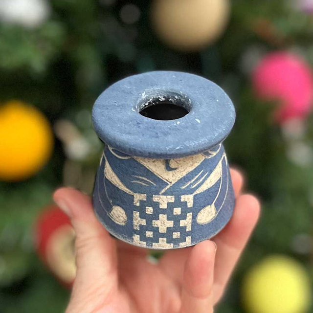 These stoneware ladies are thrown on my potters wheel in 2 parts, the body and the hat top. Once dry enough to handle, the hats are attached. The apron pattern is screen printed in my studio and attached to the lady using a transfer technique. They are then fully painted in a beautiful deep blue and when this has dried, the character is scratched and carved into the clay using a technique called sgraffito. They are then twice fired with a dip in a red iron oxide solution to give it the rustic textured 'blue stone' feel.