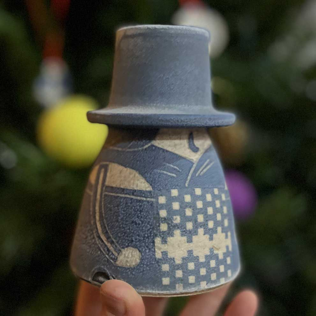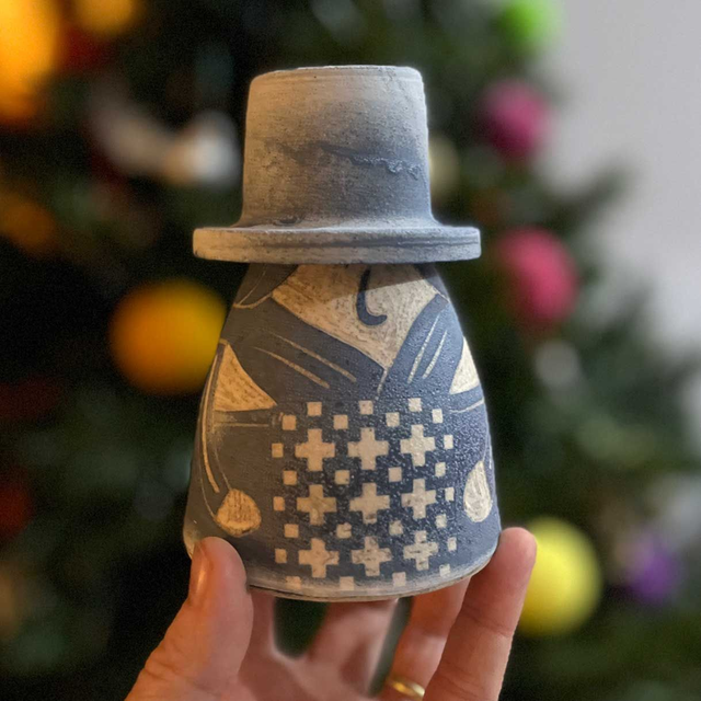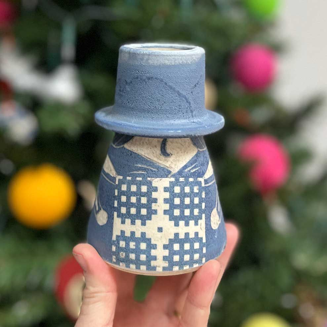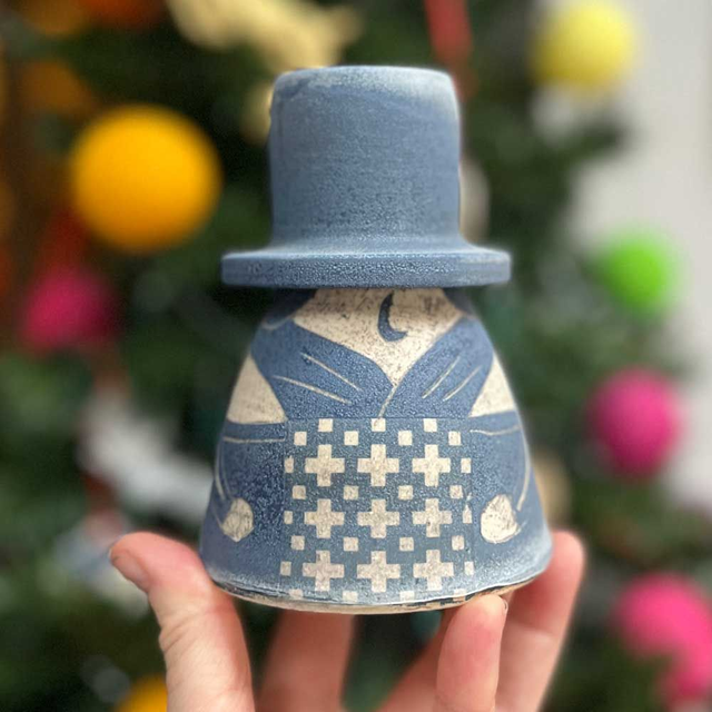 These stoneware ladies are thrown on my potters wheel in 2 parts, the body and the hat. Once dry enough to handle, the hats are attached. The apron pattern is screen printed in my studio and attached to the lady using a transfer technique. They are then fully painted in a beautiful deep blue and when this has dried the character is scratched and carved into the clay using a technique called sgraffito. They are then twice fired with a dip in a red iron oxide solution to give it the rustic textured 'blue stone' feel.
