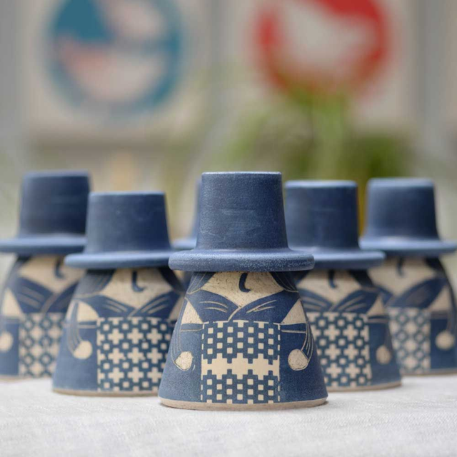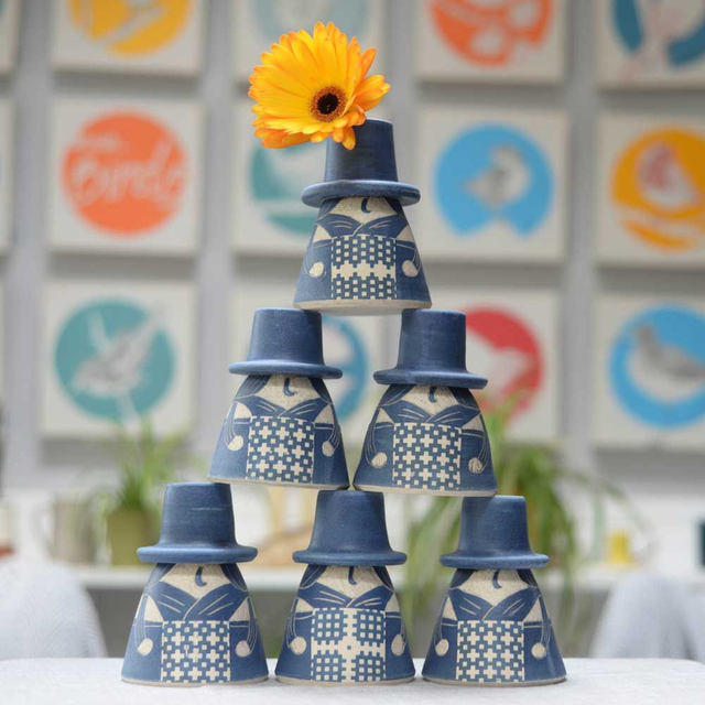 These stoneware ladies are thrown on my potters wheel in 2 parts, the body and the hat. Once dry enough to handle, the hats are attached. The apron pattern is screen printed in my studio and attached to the lady using a transfer technique. They are then fully painted in a beautiful deep blue and when this has dried the character is scratched and carved into the clay using a technique called sgraffito. They are then twice fired with a dip in a red iron oxide solution to give it the rustic textured 'blue stone' feel.